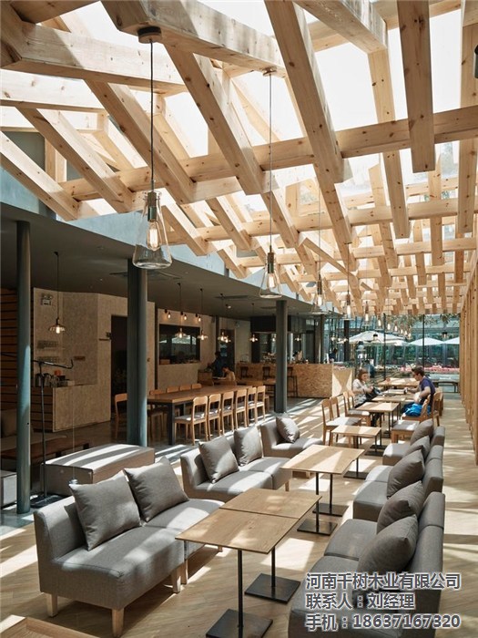 且新增的木梁在原有的鋼梁結(jié)構(gòu)之間交織穿梭,形成豐富有層次的光影效果,尤其是在天氣晴好的時候,體驗感更為直接。對于空間區(qū)域的分割,設計團隊也著手從天花板部分來創(chuàng)造。比如前述提到的主要的編織木梁結(jié)構(gòu),其下方的空間寬敞明亮,更適合于那些喜愛沐浴在陽光或自然天光之下的客人們。而靠近建筑內(nèi)部的空間,在灰黑色的天花板映襯之下,則要顯得沉穩(wěn)、私密一些,顯然更適合那些需要安靜空間的客人們。