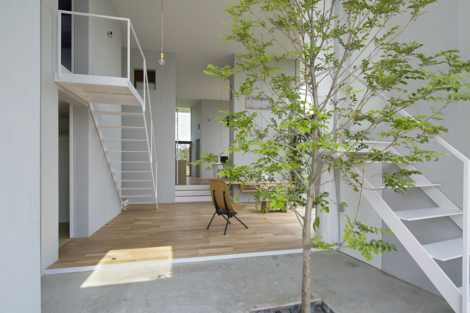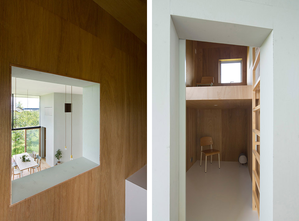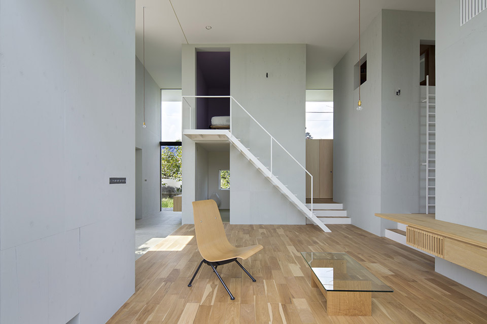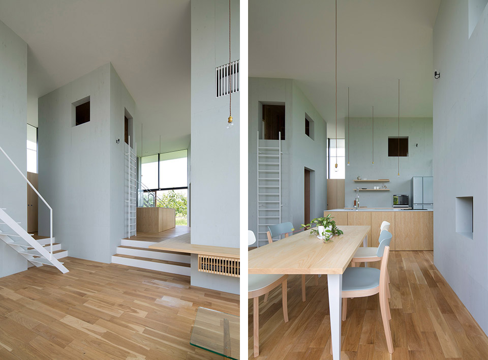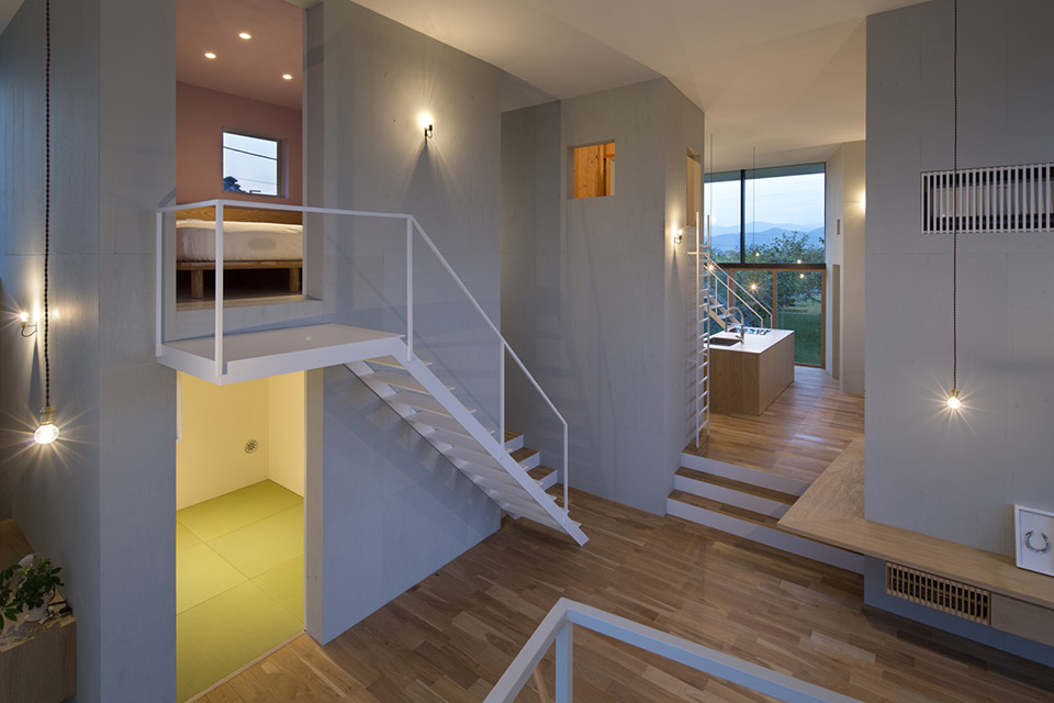 對自然開放,并受到果樹圍繞的室內公共空間讓人感到開闊而放松。公共空間的室內高度有兩層層高的尺度,為了利用結構體的上層空間,每個都有專用樓梯到達上層,其中四個樓梯放置在公共空間中,還有三個爬梯分別放置在相對應的結構體自身中。