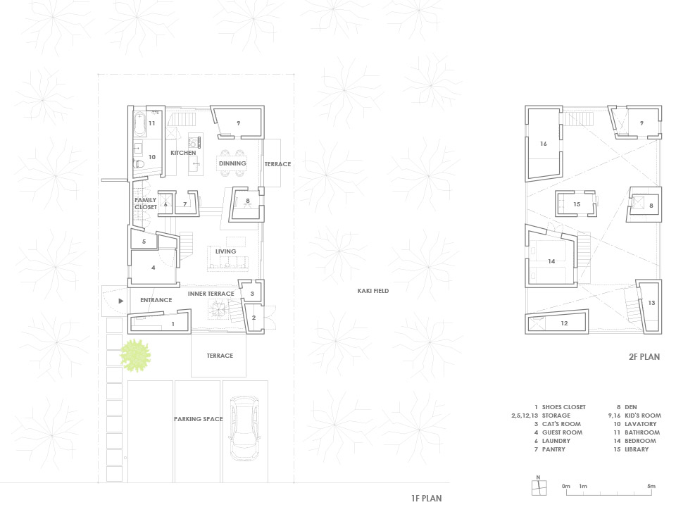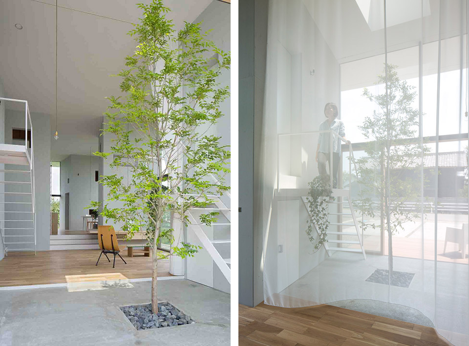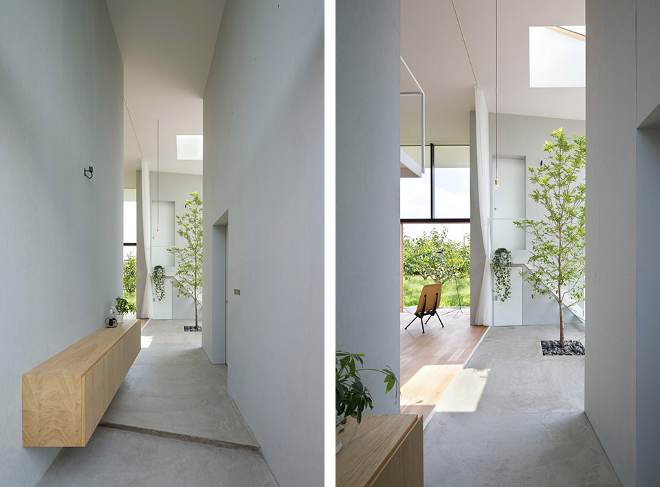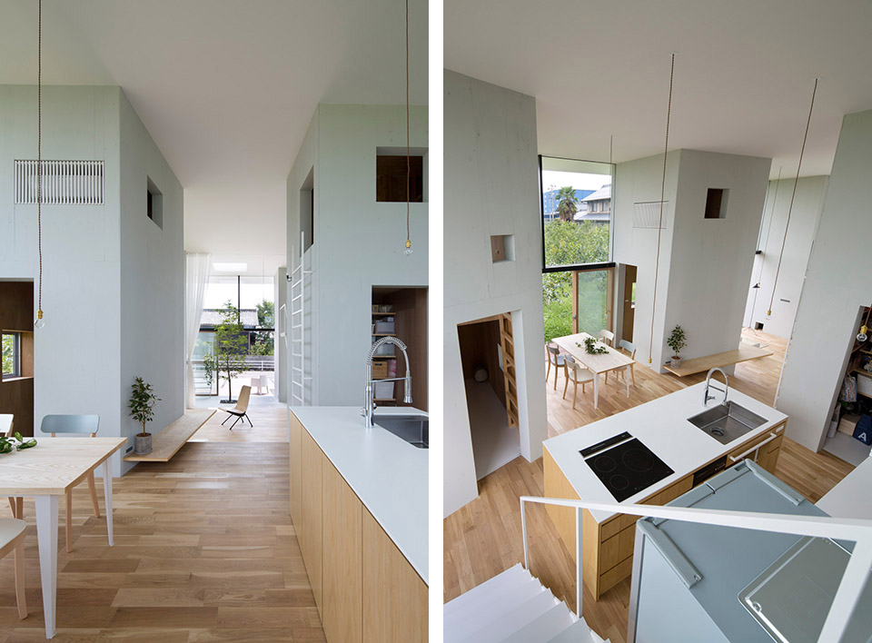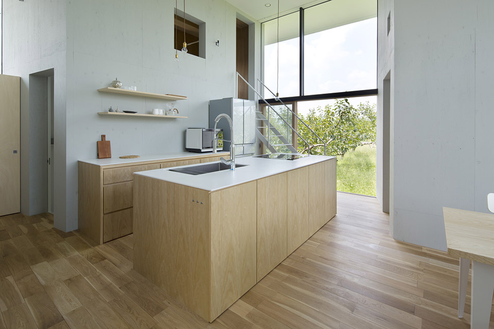 對自然開放,并受到果樹圍繞的室內公共空間讓人感到開闊而放松。公共空間的室內高度有兩層層高的尺度,為了利用結構體的上層空間,每個都有專用樓梯到達上層,其中四個樓梯放置在公共空間中,還有三個爬梯分別放置在相對應的結構體自身中。