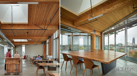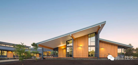 建筑物的桁架為膠合層壓板,從而優(yōu)化了這種可再生資源的結(jié)構(gòu)價(jià)值。膠合板消耗能源少于鋼筋混凝土或鋼材,可用于更長的時(shí)間跨度,可承受重負(fù)荷,并且擁有復(fù)雜 的形狀。該建筑通過了LEED環(huán)境保護(hù)認(rèn)證,包括一套可再生的膠合板結(jié)構(gòu)系、節(jié)水管道夾具、利用可回收的當(dāng)?shù)夭牧稀⑹覂?nèi)擁有豐富的自然光線以及高效的機(jī)械 系統(tǒng)、照明和外表皮。