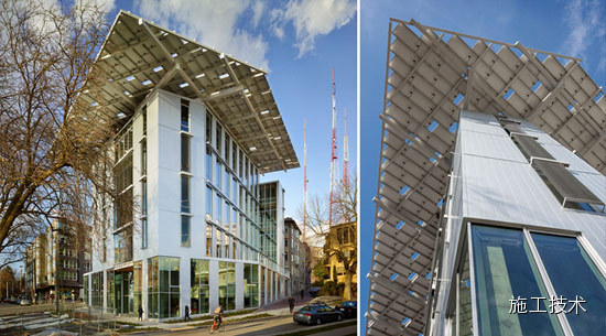 該建筑通過各種不同的系統(tǒng)達(dá)到以下這些目標(biāo),如一個(gè)高性能的建筑圍護(hù)結(jié)構(gòu);一個(gè)旨在優(yōu)化自然光的布局,估計(jì)有82%的中心空間將利用自然光采光。仔細(xì)與租戶 協(xié)調(diào),通過使用高效率的顯示器、復(fù)印機(jī)、筆記本電腦、零客戶端和基于云的服務(wù)器,以減少他們約75%的“插頭負(fù)載”。26孔、400英尺深的地源熱泵空調(diào) 系統(tǒng),將從地球收獲的能源來提供高效的加熱和冷卻,地板輻射系統(tǒng)將有效地加熱和冷卻辦公空間。242千瓦的屋頂太陽能光伏陣列將提供建設(shè)所需的所有凈能量。