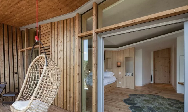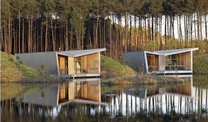 項目中所運用的斜線,以及接待處微微傾斜的角度與后面的圓形沙丘和線性冠層形成鮮明的對比。建筑與環(huán)境之間的和諧關系不是建立在模仿的基礎上,而是由一種截然相反的同源性來定義的。這些小的、獨立的單位被安置在水面上,它們是景觀中的一個重要的節(jié)點,與自然共同形成一個持續(xù)的有機環(huán)境。不同的路徑在山之間蜿蜒盤旋,以基地上各種不同的視角,你可以清晰地感覺到它的真實性。