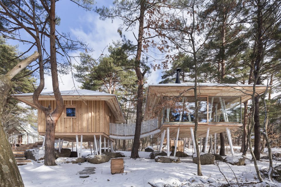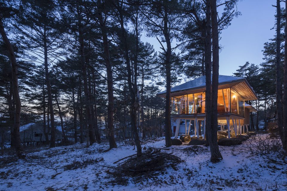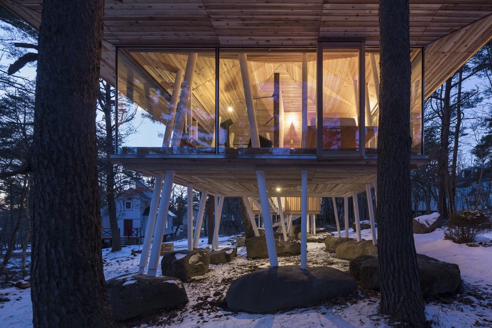 該地區(qū)常遇大雪天氣,因此建筑師利用架高的結(jié)構(gòu)為建筑賦予了2米多的雪荷載,以保證房屋不受大雪的破壞。住宅擁有兩個體量,分別容納了起居功能和生活用水功能。這兩個體量通過一座橋形成連接,使居住者能夠在橋上充分享受自然環(huán)境帶來的感官刺激。