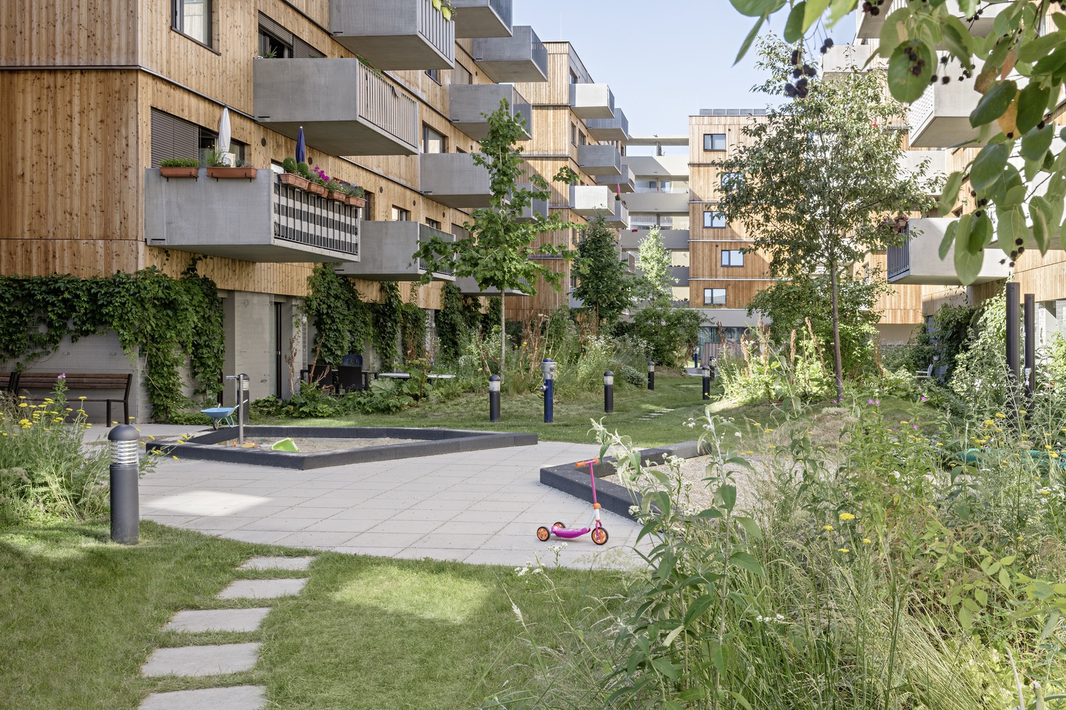 綠色的庭院與一些長滿青草的小山丘一起,形成了一個(gè)有機(jī)的景觀,這些庭院的翼形梯田有意地凸顯在中央庭院的中間。山丘、樹木和帶小樹冠的灌木遮擋了私人露臺(tái)。通往丘陵景觀的道路網(wǎng)絡(luò)被刻意限制,以防止走廊式路線的發(fā)展。在入口區(qū)、洗衣房和兒童游樂場前的路口形成了聚會(huì)場所。