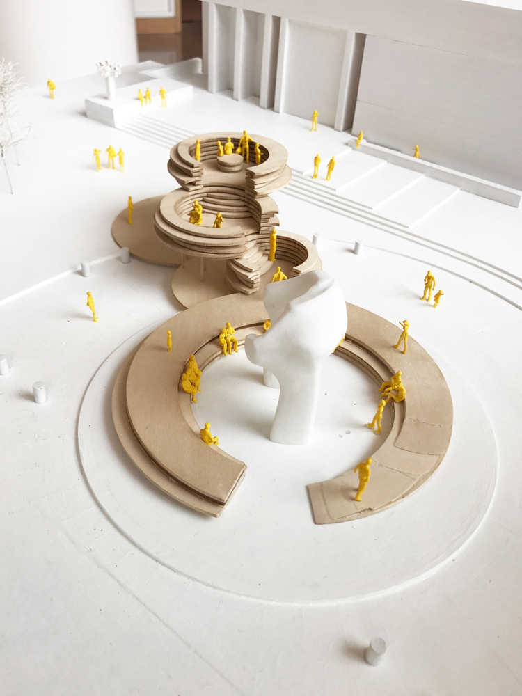通過(guò)跨越現(xiàn)在已經(jīng)不復(fù)存在的旋轉(zhuǎn)狀態(tài),占領(lǐng)現(xiàn)在是一片空白的廣場(chǎng)區(qū)域,該設(shè)施的宗旨在于恢復(fù)場(chǎng)地的空間功能,鼓勵(lì)雕塑周?chē)膭?dòng)態(tài)流通,并使人們以新的方式從水平和垂直兩個(gè)方向體驗(yàn)這個(gè)廣場(chǎng)。