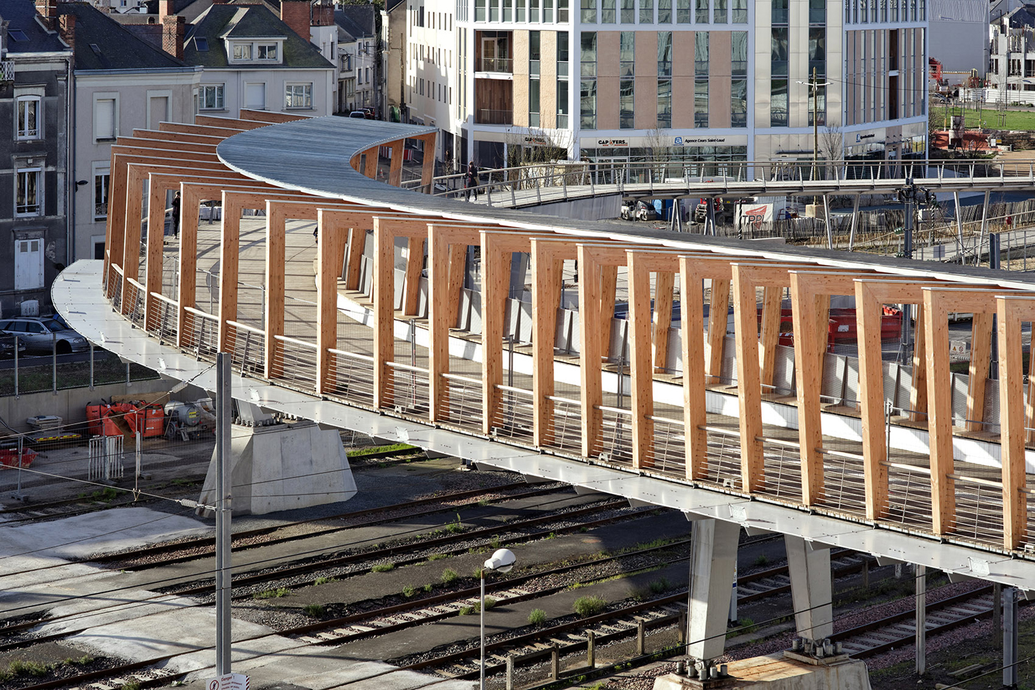 Dietmar Feichtinger建筑事務(wù)所在昂熱Saint-Laud火車站設(shè)計(jì)了一座新的橋梁,供行人和自行車使用。橋梁呈柔軟的弧線形,跨越總寬度達(dá)70米的一道道鐵軌,融入到城市的地形之中。橋面由中空箱體和鋼架組成,弧線西側(cè)整合有木制長(zhǎng)椅。項(xiàng)目整體優(yōu)雅而輕盈,將不同地區(qū)連接在一起。由膠合木梁組層面的框架支撐屋頂和照明系統(tǒng),呈現(xiàn)出驚人的效果,使橋梁成為一個(gè)吸睛的新地標(biāo)。橋的剖面不斷變化,形成動(dòng)態(tài)的空間,讓人們?cè)谶M(jìn)入、爬上樓梯、漫步、等待、坐下休息、觀看和離開(kāi)等行為狀態(tài)下體會(huì)到不同的空間特點(diǎn)。項(xiàng)目為一個(gè)單體結(jié)構(gòu),尺度與所在區(qū)域相呼應(yīng),施工精美,提升了人們對(duì)該區(qū)域的關(guān)注度。弧形結(jié)構(gòu)讓橋面可以緩慢抬升,連接新建的Place Giffard-Lagenvin散步道和另一側(cè)的公園。三臺(tái)電梯和樓梯在車站、酒店,以及開(kāi)往巴黎和南特的火車站臺(tái)之間創(chuàng)造了無(wú)障礙連接,方便騎自行車的人使用。橋梁外形美觀,展現(xiàn)了改造后車站地區(qū)的新樣貌。