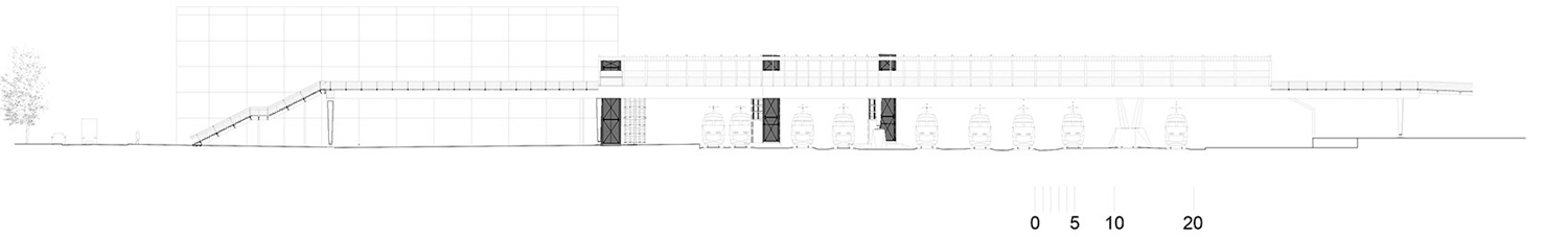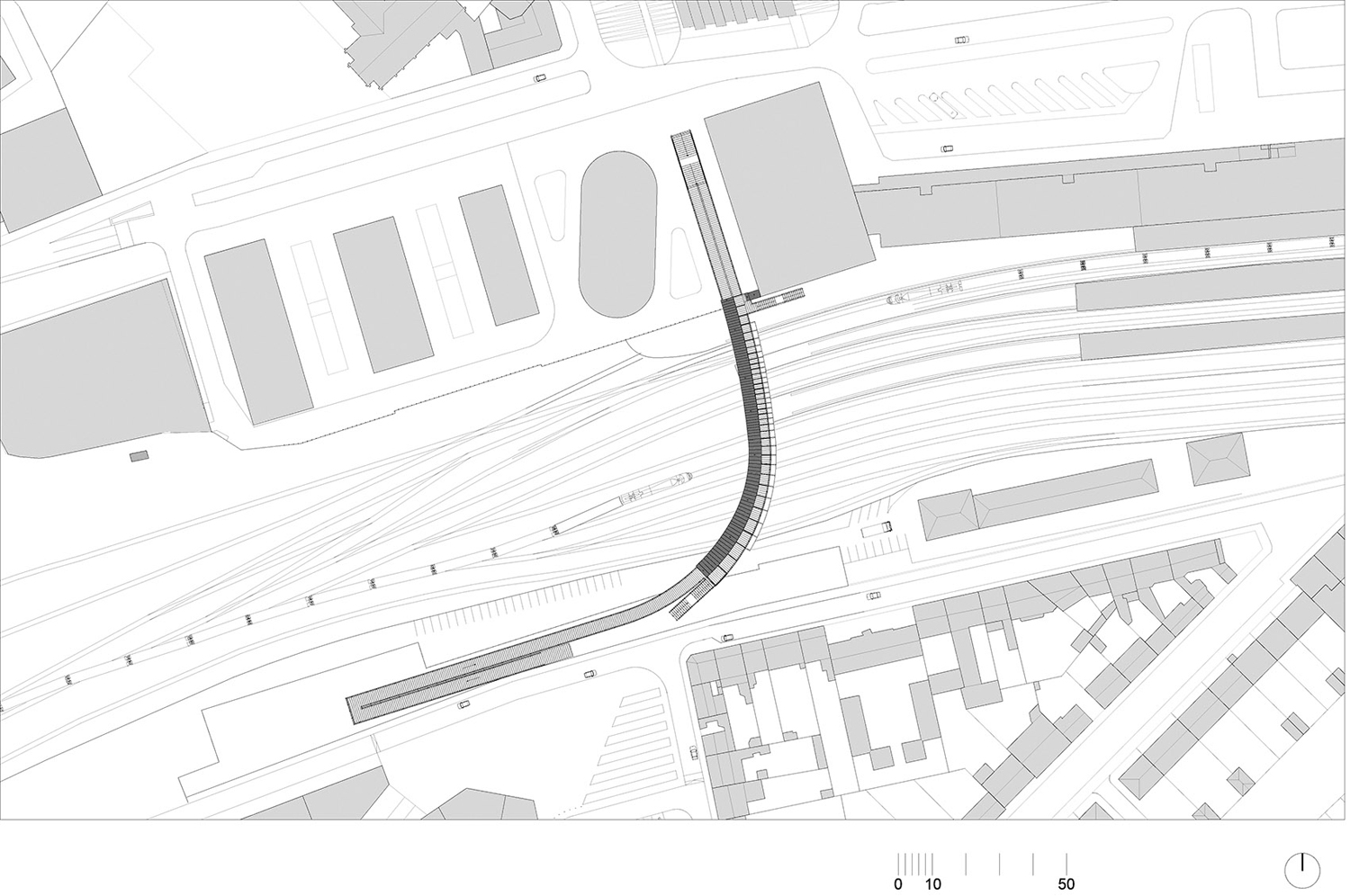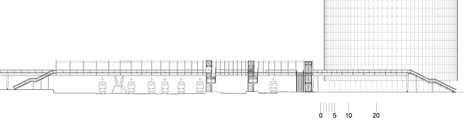 城市開(kāi)發(fā)計(jì)劃對(duì)這片區(qū)域進(jìn)行升級(jí)。車站一側(cè)的Auguste Gaultier大道上已經(jīng)建造了一棟辦公樓和一座多層停車場(chǎng);另有一棟酒店正在施工。鐵軌南側(cè)的Fulton街上則將建設(shè)一條新的散步道。這座供行人和自行車使用的天橋是區(qū)域現(xiàn)代化的一部分,由獲得競(jìng)賽優(yōu)勝的Dietmar Feichtinger建筑事務(wù)所負(fù)責(zé)設(shè)計(jì)。他們的設(shè)計(jì)遵循城市尺度,跨越鐵軌形成的屏障,并且設(shè)置電梯和樓梯,幫助身體不便的人直接到達(dá)站臺(tái)。
