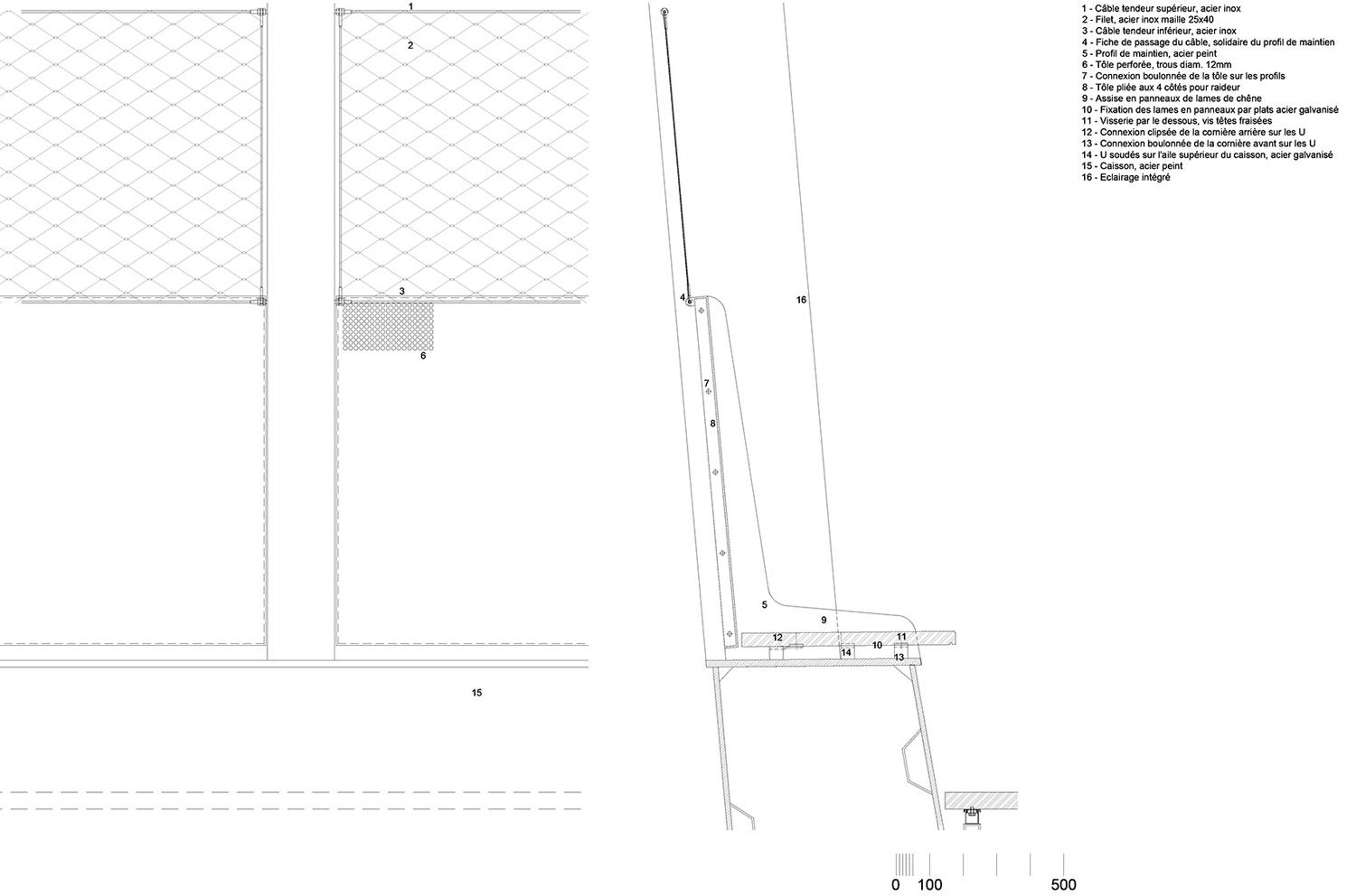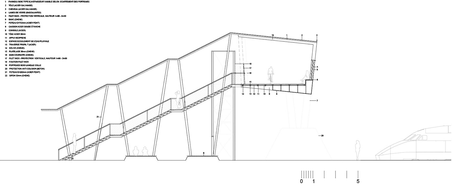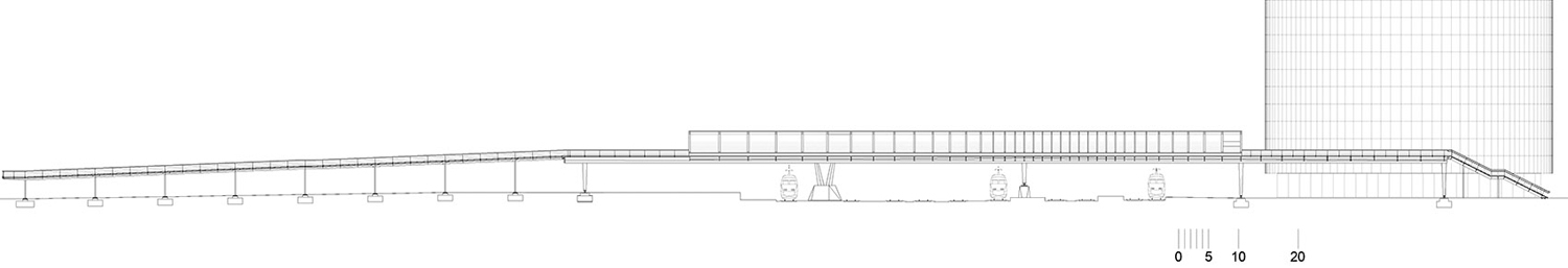 木廊是橋梁中最具代表性的 元素。它們標(biāo)識(shí)了橋梁的入口和交匯處,與城市形成對(duì)話。同時(shí),它們打斷了人們?cè)跇蛏系穆贸獭D纠戎g距離不同,結(jié)合橋體本身的弧度,創(chuàng)造了不斷變化的視野,讓人們可以一直從新的角度觀看鐵軌以及來(lái)去的車輛。越靠近橋梁中部,木廊越密,隱蔽的空間氛圍邀人停留;在橋梁的兩端,木廊之間的距離更大,提供更加廣闊的城市視野。建筑師對(duì)項(xiàng)目體量的考量包含對(duì)柱廊形狀的設(shè)計(jì),其傾斜的角度隨運(yùn)動(dòng)的節(jié)奏變化,截面在通往橋梁中部的過(guò)程中不斷擴(kuò)大。越來(lái)越開(kāi)放的框架突顯了橋梁在鐵軌上方的重要性。
