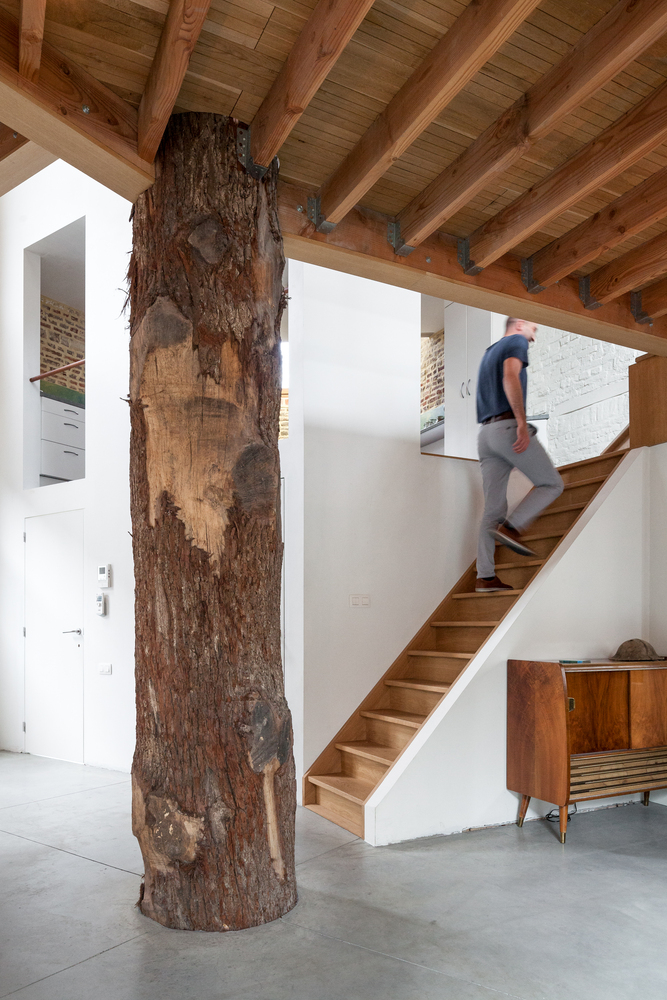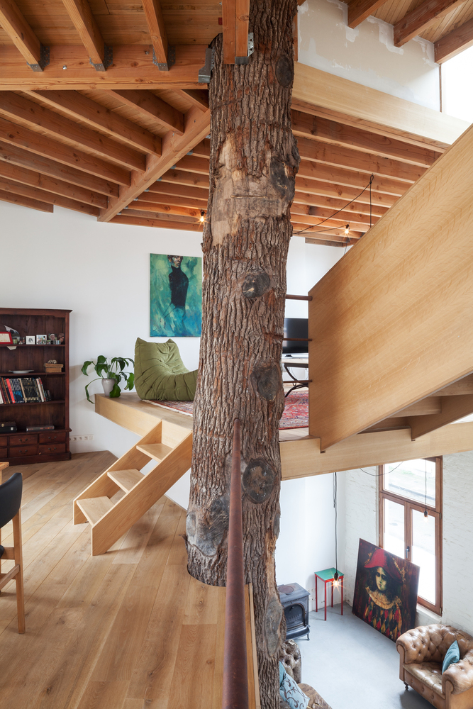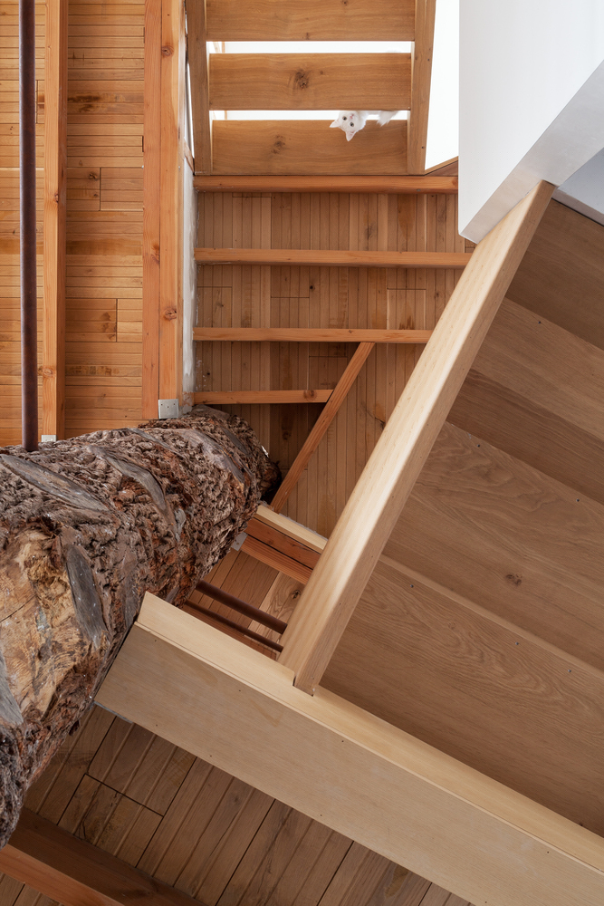 一段橡樹(shù)樹(shù)干被放置在五邊形平面正中間,作為新的支撐結(jié)構(gòu)。新的上層樓層懸掛在原有外墻和中心支柱之間,呈螺旋式上升。這樣就在生活區(qū)域內(nèi)創(chuàng)造出沒(méi)有任何內(nèi)墻的開(kāi)放室內(nèi)空間。樹(shù)干中柱是一個(gè)合乎邏輯且經(jīng)濟(jì)實(shí)惠的解決方案,它立即為新居所帶來(lái)了合適的氛圍。衛(wèi)生間、廚房、入口和儲(chǔ)藏室/洗衣房都設(shè)置在縱貫上下的封閉體塊中。