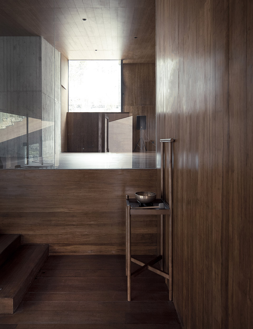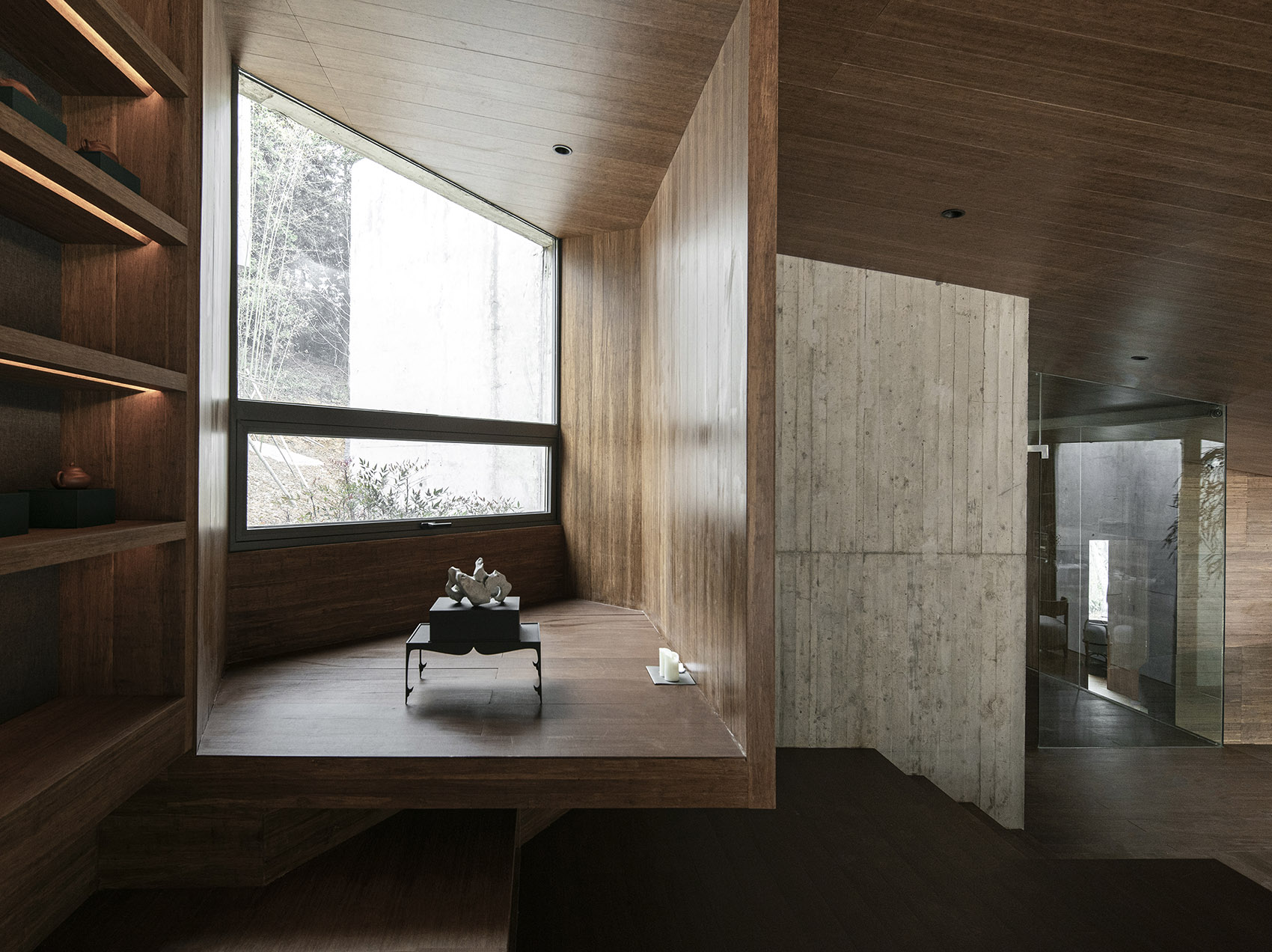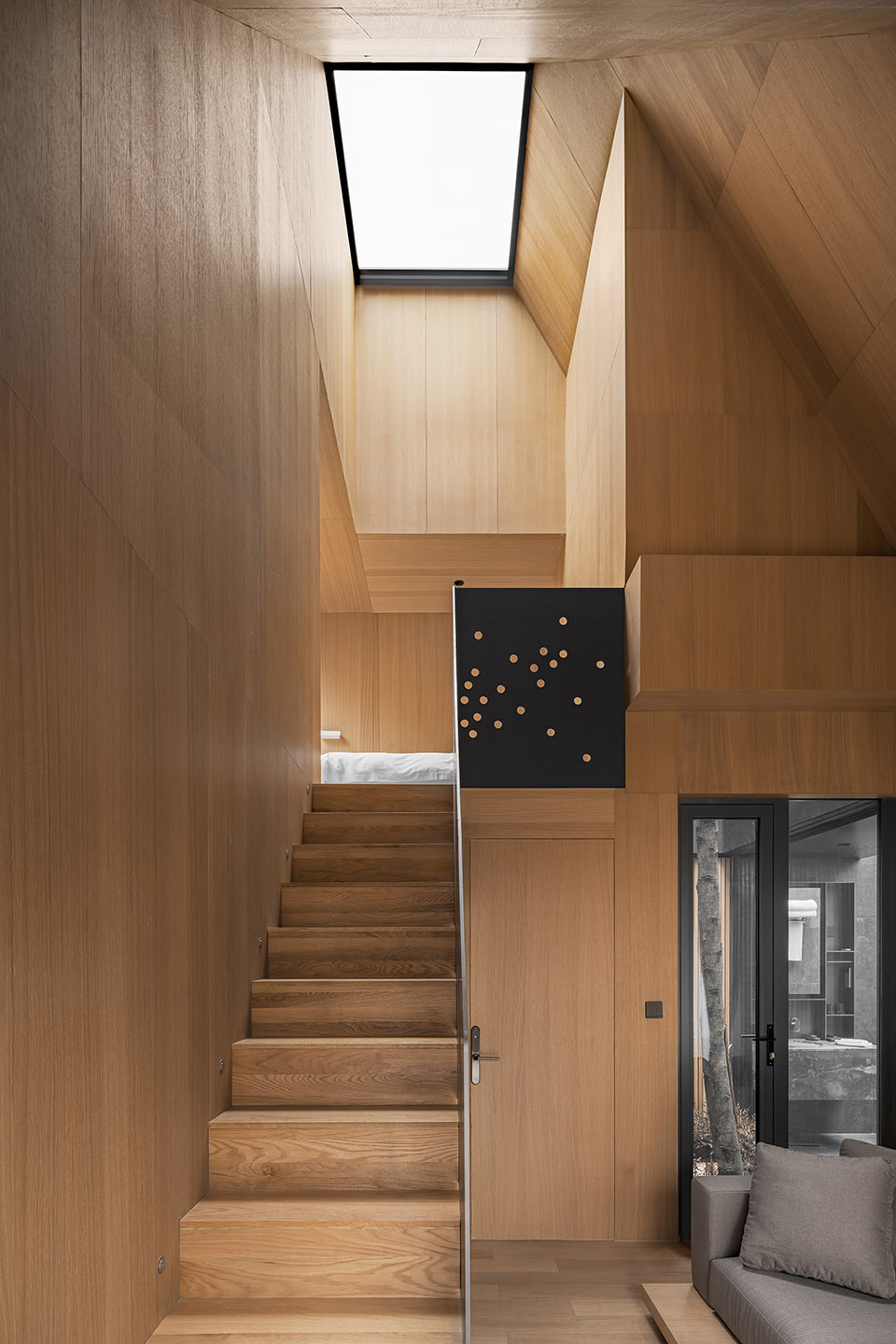 內(nèi)部每個標(biāo)高的空間,都有相應(yīng)的落地玻璃立面,錐形的頂部設(shè)置了可以看向天空和樹冠的天窗,形成了分別朝向不同的方向看風(fēng)景的組合,將外部的景觀投射到整個空間內(nèi)部,外部的風(fēng)景成了建筑的主要元素,形成空間特有的張力,這一切都是為了居于室內(nèi)可以獲得對自然更多的感知。