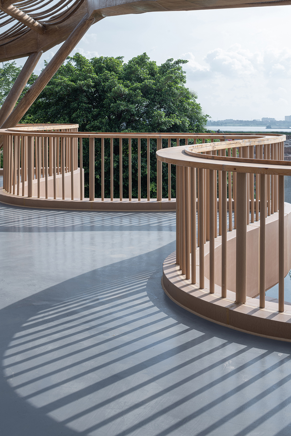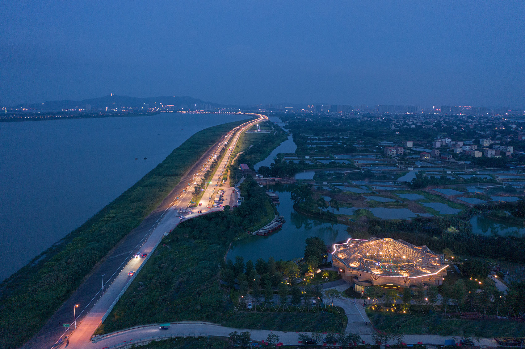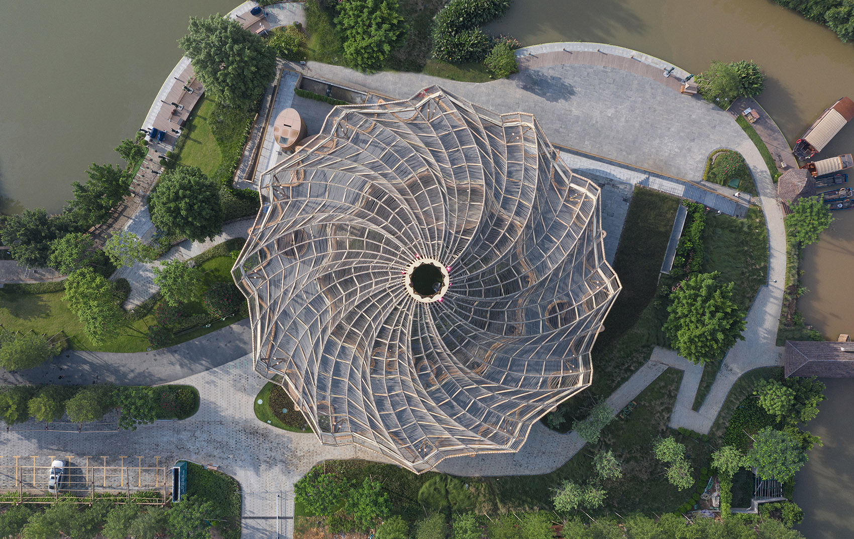 該項目設(shè)計靈感源自于古勞水鄉(xiāng)荷塘水道的行船體驗。炎炎夏日,在荷葉叢中看著風吹荷動,感受著微風拂面,輕松愜意。古勞水鄉(xiāng)賓客中心,立體化抽象了荷葉褶皺的肌理,為四方賓客營造了駐足停留、遠眺西江,以及放松冥想的公共休憩空間。