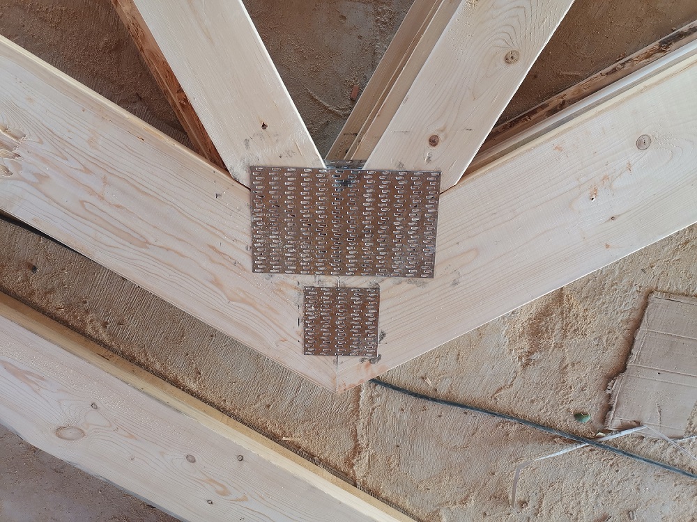 齒板連接主要用于輕型木結(jié)構(gòu)建筑中規(guī)格材制成的輕型木桁架節(jié)點(diǎn)連接。輕型木桁架是北美輕型木結(jié)構(gòu)體系中屋架體系的主要結(jié)構(gòu)形式。其特點(diǎn)是支撐形式靈活,桁架間距較密,通常小于600 mm。在桁架連接處應(yīng)用齒板,可以較快的進(jìn)行桁架中各弦的定位。即在工廠中拼裝好一品桁架后,將桁架平放,同時(shí)用專(zhuān)門(mén)的壓力機(jī)將齒板直接壓入桁架中各條弦之間的連接處。齒板連接其最大的優(yōu)點(diǎn)是提高了施工效率,保持了木材的完整性。同時(shí)齒板作為連接件,與木材之間表現(xiàn)較好的協(xié)同作用,塑性性能良好。